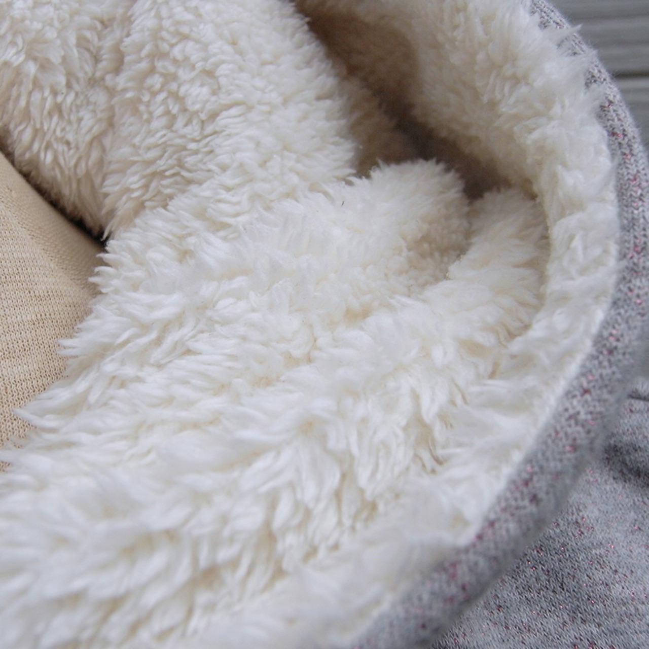 アディダスのグレー&赤ラメ・裏起毛フード袖口ボア付きパーカーです。