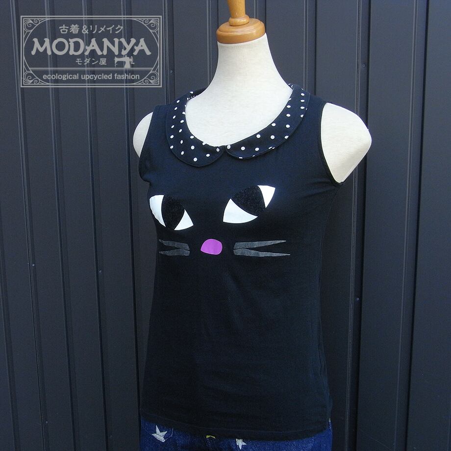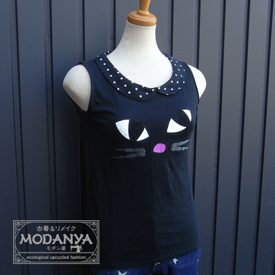 LULU GUINNESSのブラック襟付き猫柄タンクトップです。